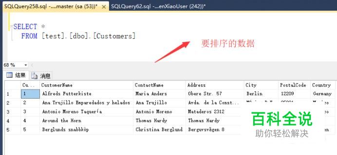 接下来我们直接运用Order By对数据中的ContactName字段进行排序,如下图所示,默认是升序