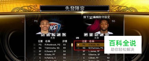 在这里可以看到双方球队的先发阵容,这时你就可以根据对方的先发来调整自己的先发,比如你想让韦德当控球后卫,让查莫斯当得分后卫,那就先点一下查莫斯,当他前面的小方块亮了,再点一下韦德,他们就互换位置了。如图2。