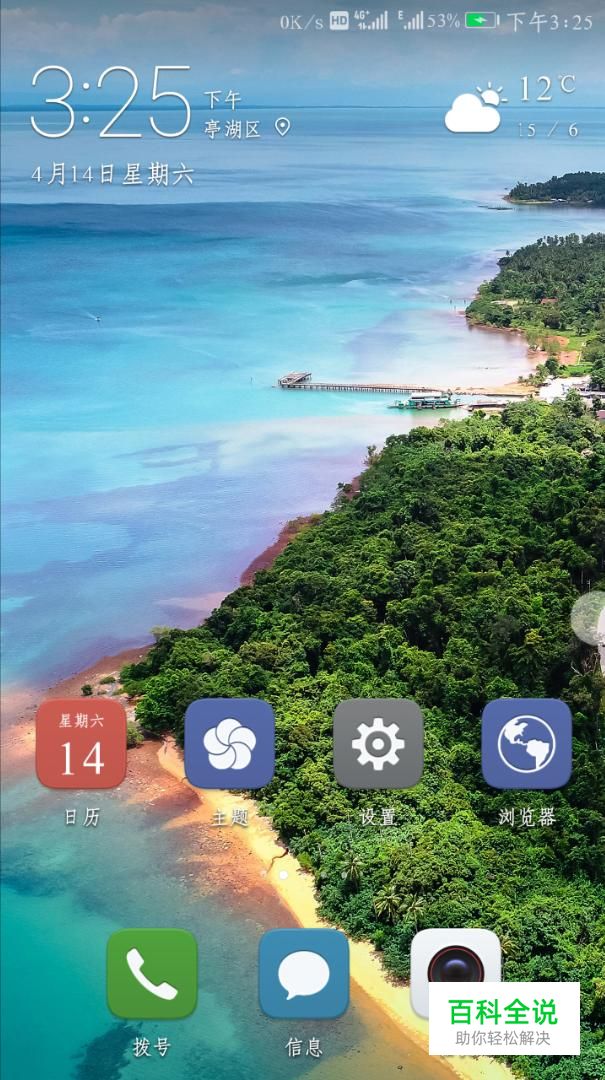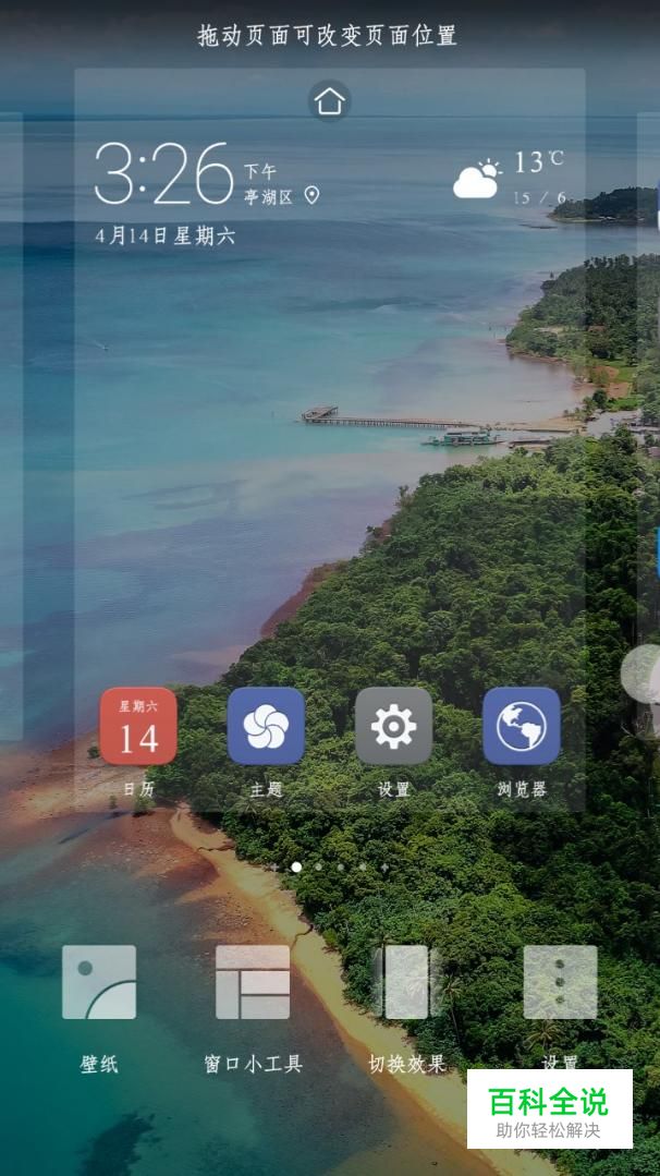 然后用手指长按桌面空白处2~3秒,就会进入手机桌面编辑功能页面。