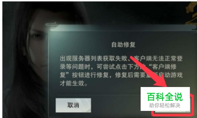 在弹出的对话框内选择客服端修复,点击.然后会再弹出一个对话框点击确定.
