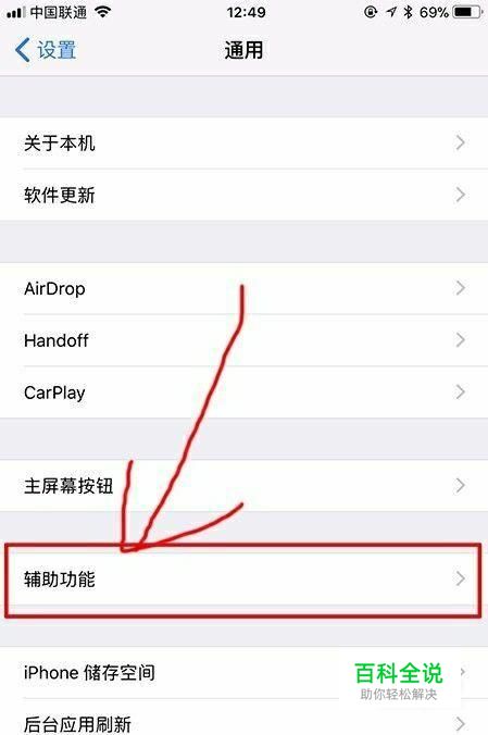 进入“通用”界面后,找到选择项中最下方的“辅助功能”,点击进入。