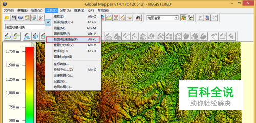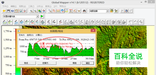 剖面生成 加载等高线DEM后,可以通过工具栏->工具->剖面/视线路径来生成剖面图。