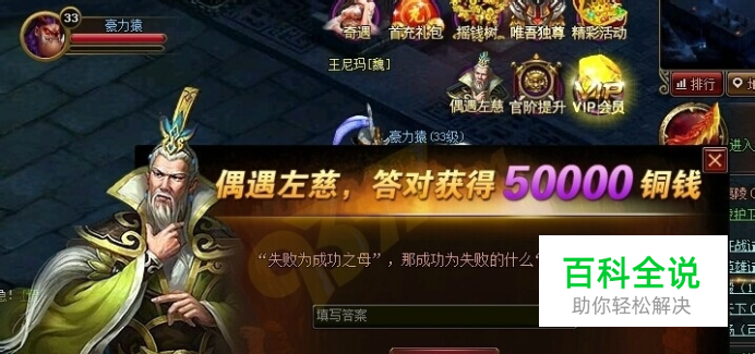 在三国时期,左慈是东汉末年著名方士,他戏耍诸侯,以方术名闻当世,并且收葛玄为徒。在9377盛世三国2网页游戏里,大家如果能遇到左慈,见上一面会有意外的收获。那盛世三国2偶遇左慈怎么玩呢盛世三国2偶遇左慈奖励有哪些呢下面就让小编来告诉大家吧。 盛世三国2偶遇左慈是游戏里一个特色玩法,左慈会不定时与各位玩家相遇,他是可遇不可求的哦。如果玩家运气好,与左慈见上一面。在玩家游戏屏幕上方会有出现一个“偶遇左慈”的图标,玩家可以点击该图标,将进入到一个问答界面。“偶遇左慈”的图标会持续10分钟,如果玩家10分钟内,不对该图标进行处理,10分钟后该图标自动会消失掉。 在偶遇左慈的问题界面里,左慈会随机出一道问题给玩家,玩家可以根据问题,在界面里的输入框里输入正确的答案。这些问题涉及到各个领域。如果这些问题比较难,大家可以通过“不会你就问啊,点击求助”的功能,将为问题发到聊天频道,让自己国家的伙伴们帮忙找找答案。玩家可以有3次机会输入答案。如果3次答案都错误,偶遇左慈图标将会消失。 当玩家答题正确后,游戏界面会跳出一个恭喜你答对问题,获得50000铜钱奖励的提升。大家按确定按钮,就可以领取到答题奖励。