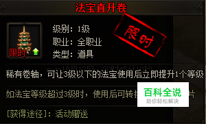 在赤月传说2中有这么一个稀有卷轴——法宝直升卷,视为赤月大陆中有谁不想获得。下面就让我来介绍一下法宝直升卷的获得途径以及法宝直升卷的作用。 在赤月传说2中法宝直升卷是属于稀有卷轴,然而他却没有职位限制,是全职业均可以使用的。 赤月传说2中的法宝直升卷的获得途径是通过活动赠送获得。法宝直升卷的作用是让3级以下的法宝使用后立即提升一个等级,如果法宝等级超过3级,使用后即可转换成500法宝碎片。 关于赤月传说2的法宝直升卷的获得途径和作用就说到这里了,希望对你们有帮助。