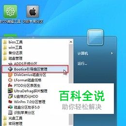 进入到快启动win8pe系统后,依次点击桌面左下角的“windows图标--磁盘管理--BOOTICE引导扇区管理”,打开引导扇区管理工具,如下图所示: