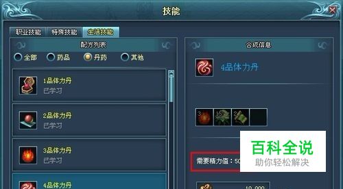 在生活技能上,药品、丹药、宝镜、炸药包的合成都需要消耗一定的精力值