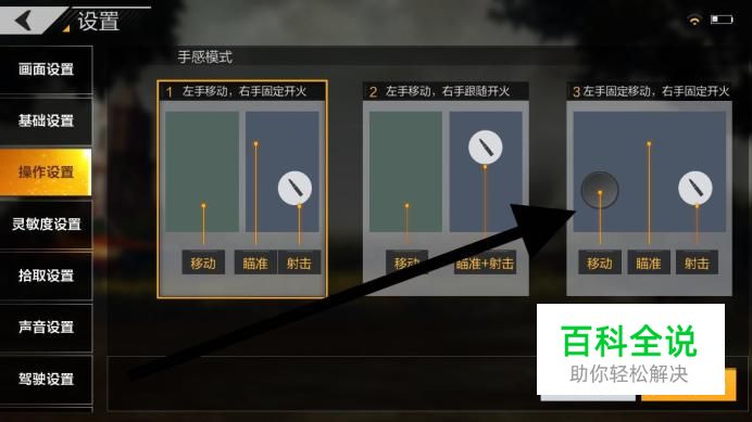首先从射击方面来讲,如图,这是射击方面有三个选项我建议大家选第三个,因为在操作的时候,当你开镜之后你可以用左手进行调节很方便