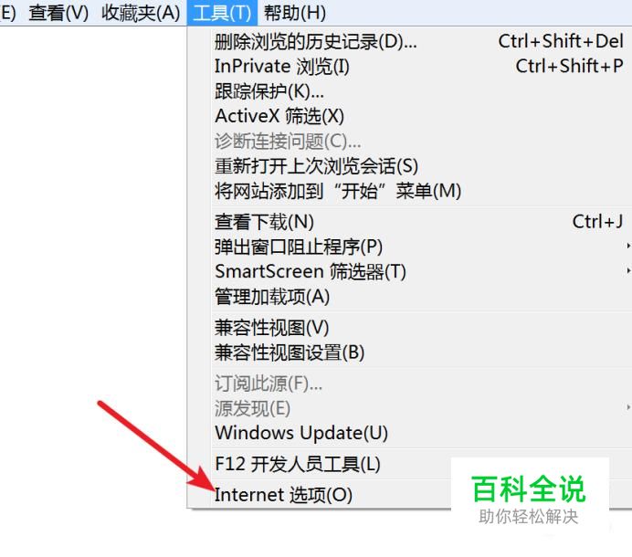 打开IE浏览器,点击‘工具’下的“Internet选项”