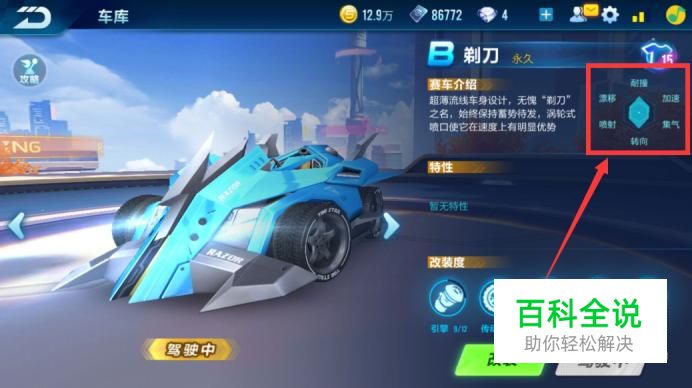 在车库中找到剃刀,会在剃刀的介绍里看见,剃刀在转向和耐撞方面有着很大的优势,那么我们就着重的对这两项进行改装。
