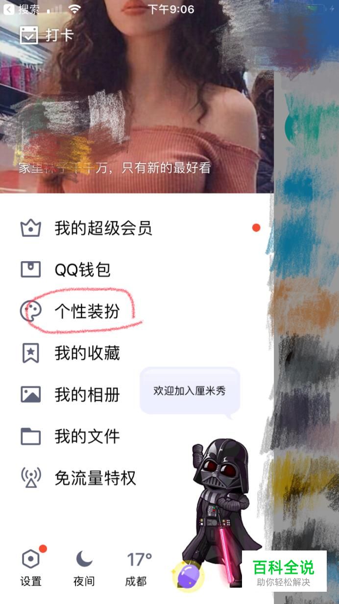 首先打开手机qq,点击左上角自己的头像就会出来如下图所示界面,点击个性装扮。