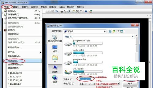 首先让我们来回忆一下历史久远的手动记录日志功能:“文件”——“会话日志”,选择日志文件的存放位置并拟定文件名,点击保存。