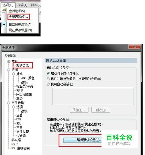 自动记录日志功能: 1. 选择“选项”——“全局选项”,打开全局选项,在常规设置中找到“默认会话”设置项,点击右侧的“编辑默认设置”: 英文版下:选择“Options”——“Global Options”,打开全局选项,在常规设置中找到“default session”设置项,点击右侧的“edit default settings”: