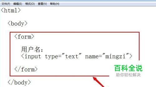 光标定位到<body></body>之间,输入 <form> 用户名: <input type="text" name="mingzi"> </form>