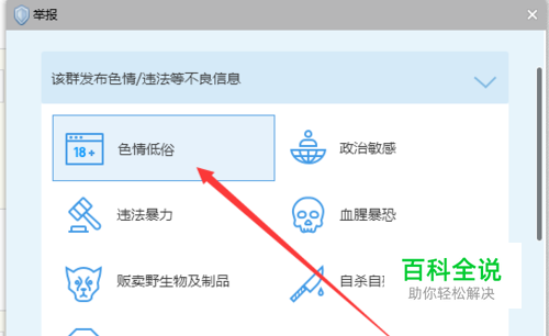 点击后,会显示更多细化的举报内容,包含很多分类,如果是黄群,需要选择第一个选项,如下图所示。