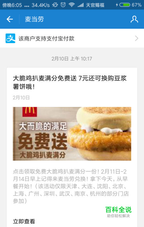 慢慢发现互联网产品APP的优惠活动增加了不少,比如支付宝的红包活动,今天我又发现另外一个活动,可以免费领取一份麦当劳的早餐,分享给大家。