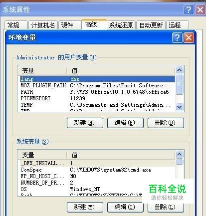 在系统属性对话框里,点击“高级—环境变量”,进入环境变量对话框。
