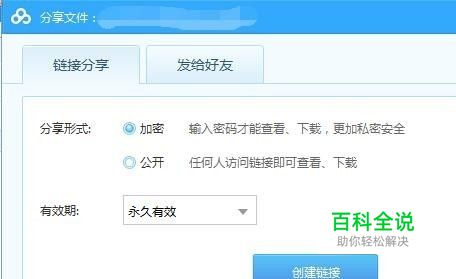 如果是分享给非好友,选择第一界面,即链接形式,这里先勾选第一种,加密方式,有效期根据需要设置,最后开始创建。
