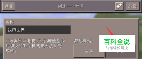 在手机版我的世界里面有两种模式,一种生存模式、另外一种是创造模式。我们在创建一个世界时,注意一下,选择创造模式才能飞行。(下方图2)就是生存模式,在生存模式游戏中是无法飞行的。