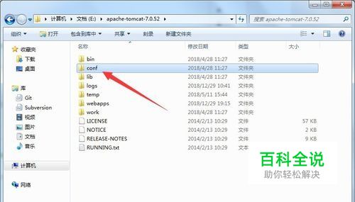 本文以Tomcat为web服务器,以访问Tomcat上面某张图片为例,介绍一下怎么用浏览器访问一个web服务器的某个文件,首先准备好Tomcat并进入Tomcat的目录,选择conf文件夹,设置要访问的端口号,如图所示。