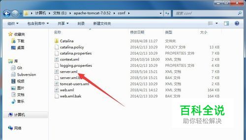 进入conf文件夹之后,选择server.xml文件,这是配置服务的基本文件,点击进入,如图所示。