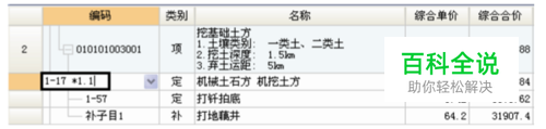 选中挖基础土方清单下的1-17子目,点击子目编码列,使其处于编辑状态,在子目编码后面输入□*1.1,如图