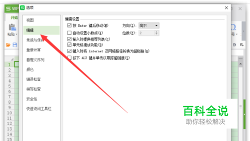 5、在wps 表格【选项】对话窗口中,在左侧窗格将选项卡切换到“编辑”选项卡栏。如图所示;