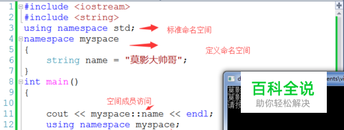 命名空间的引入:增加标识符的使用效率。 1.命名空间的定义 :namespace 标识符{ } 例:namespace my{int a=1;} 命名空间中的成员访问:作用域分辨符:: 例: cout<<my::a<<endl; 省略限定符(前缀):using namespace my; 联想到 标准命名空间 :using namespace std; 标准命名空间 没有这个,需要加std::cout ,std::cin ,std::endl; 2 .命名空间的嵌套: cout<<my::danny::b<<endl;不想使用这么长的前缀 第一种:using namespace my::danny; 第二种: namespace IM=my::danny