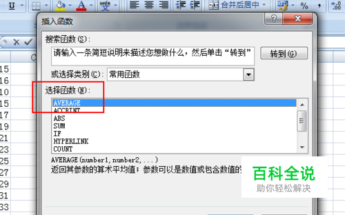 点击上方函数Fx处,选取AVERAGE函数并单击确定。