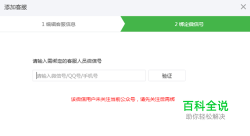 输入需绑定的客服人员微信号,点击输入框旁的“验证”,确认此微信号已经关注公众号后,即可邀请其绑定。 注意,输入的是微信号、QQ号或手机号,而非微信昵称。