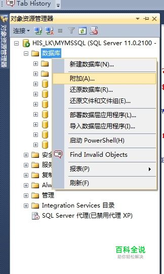 打开SQL Server Management Studio,并连接上数据库。右键“数据库”弹出快捷菜单,点击“附加”菜单。