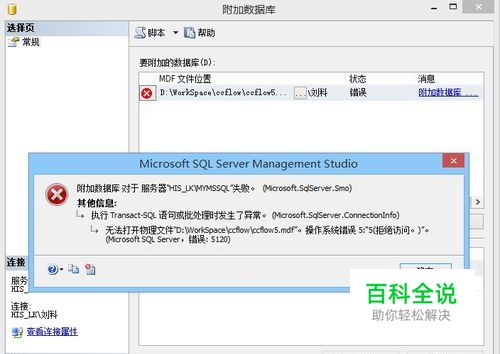 点击 附加数据库 界面的确定后,附加数据库发生报错。 错误信息为: 无法打开物理文件“***.mdf”。操作系统错误 5:“5(拒绝访问。)”。 (Microsoft SQL Server,错误: 5120)