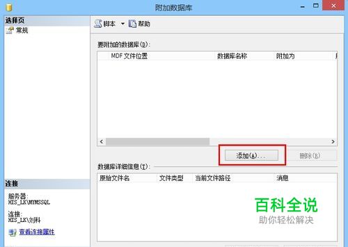 附加数据库界面点击“添加”按钮,浏览到需要附加的数据库文件。