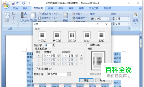 八、在打开的分栏对话框中,在列数种输入需要分栏的数字,然后再点击“确定”按钮。如图所示;