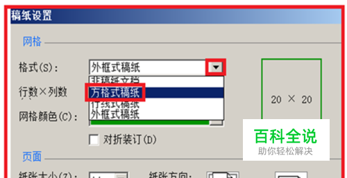 4、单击一下格式后面的黑色三角,会出现四种格式形式,非稿纸文档,方格式格式,行线式格式和外框式格式,选择一个格式,单击一下,比如方格式格式,就会出现行数和列数,在右侧有预览效果,单击下方的确定就可以了。