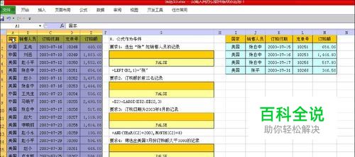 条件四、筛选出美国7月份订购额大于1000的记录 步骤1:在条件区域G16中,写入公式 =AND(A2="美国",MONTH(C2)=7,E2>1000);注意G15留空不写。 步骤2:选定数据源区域A2:E22。数据/排序和筛选/高级,出现对话框 步骤3:对话框中“列表区域”的值,就是前面选定的范围;在“条件区域”的值中,点一下,再选定条件区域(本例是G15:G16)。 步骤4:在对话框中“方式”选项下,勾选“将结果复制到其他位置”;然后在“复制到”后面输入要存放结果的第一个单元格。(本例选择I18) 步骤5:点击“确定”即可完成,结果如图。