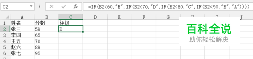 在评级列输入公式: =IF(B2<60,"E",IF(B2<70,"D",IF(B2<80,"C",IF(B2<90,"B","A"))))
