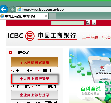 用 IE 浏览器(或兼容工行网银的浏览器)打开工行官方网站,在网站首页点击“个人网上银行登录”。