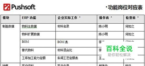 建立用户文档 在建立应用系统的同时,除了必须对软件进行二次开发,按软件工程要求提供必须的文档以外,对管理要改进的流程及方法等方面,也必须编写或修改原来的制度、职责、流程图。这时,系统一旦已建立起来,可着手对最终用户的主要应用进行培训。 参考手册文档编制计划 文档编写标准/格式 系统操作手册 扩展程序文档/技术手册 业务流程/用户参考手册 最终用户(岗位)培训教材 文档更改控制 下面是Pushsoft提供的部分标准化的文档: 产品操作手册 产品白皮书 产品、模块建议 业务作业指导书SOP 标准业务流程图 管理员指南