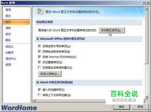 第2步,在打开的“Word选项”对话框中切换到“校对”选项卡,在“自动更正选项”区域单击“自动更正选项”按钮。