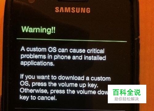 把关机并进入下载模式,手机在关闭状态下,同时按住音量向下键+home键+加开机键,就会出现警告提示