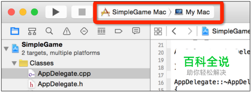 注意:使用不同的shell可能会导致你看到不同的输出结果。在上面的屏幕截图中,由于我使用了Bash,安装文件提示“source /Users/rwenderlich/bash_profile.”。但如果我用的是Zsh,那它就会提示让我运行“source /Users/rwenderlich/.zshrc”。按照说明输入命令。这里有一个节省时间的技巧:你可以在/Users/your_user_name这里使用波浪线(~),以此来减少你输入下面这条命令的长度:source ~/.zshrc (or source ~/.bash_profile)此命令重新提交了你的shell配置,让它可以访问新变量。现在你可以从任一目录在Terminal中调用cocos命令了。运行下面的命令,创建一个名为SimpleGame的C++游戏模板:cocos new -l cpp -d ~/Cocos2d-x-Tutorial SimpleGame你的主目录里创建了一个名为Cocos2d-x-Tutorial的目录。其中,子目录SimpleGame存放了你的项目文件。注意:可以输入cocos --help或cocos -h来获取cocos子命令的相关信息。输入后缀“--help”或“-h”,你可以了解到子命令的各种选项,例如你可以输入cocos new -h来查看new命令的选项。在Finder中双击~/Cocos2d-x-Tutorial/SimpleGame/proj.ios_mac/SimpleGame.xcodeproj,在Xcode中打开项目。进入Xcode之后,请确保SimpleGame Mac处于活跃状态,如图所示: