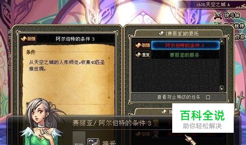 任务完成后回去找阿尔伯特,他要你去找赛丽亚,也就是每次大家进游戏时所待房间里的那位MM。我给大家标一下都在哪可以找到赛丽亚。赛丽亚要求你去找40张圣痕丝绸来,如果没钱,就去亚蒙上层那刷人形师吧。如果有。800/1个收是很快就收到的。