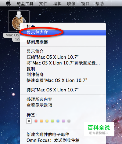 右键单击Mac OS X Lion 10.7,选择“显示包内容”,如下图