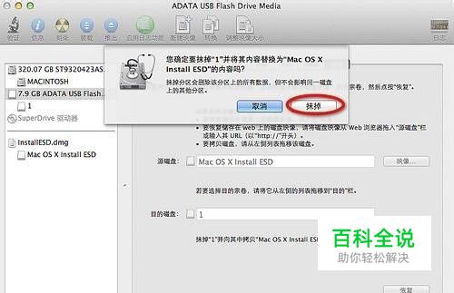 分区方案选择“GUID分区表”。单击“好”回到分区界面,单击“应用”对U盘进行分区和格式化。U盘格式化完成后选择“恢复”选项。将刚才格式化好的U盘“1”拖拽到目的磁盘右边的栏目中,在将“Mac OS X Install ESD”拖拽到源磁盘右边的栏目中,单击“恢复”