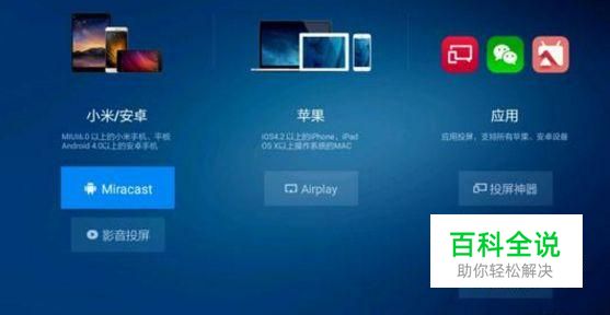 接下来我们点击进入Miracast应用里面,在众多的选项中找到自己连接方式(手机连接电视方式有很多:苹果系统、安卓系统、单独的软件等)