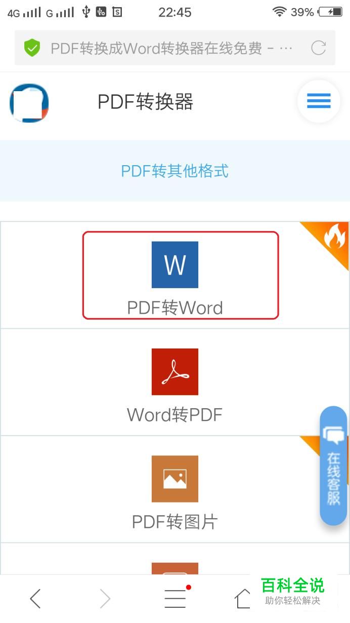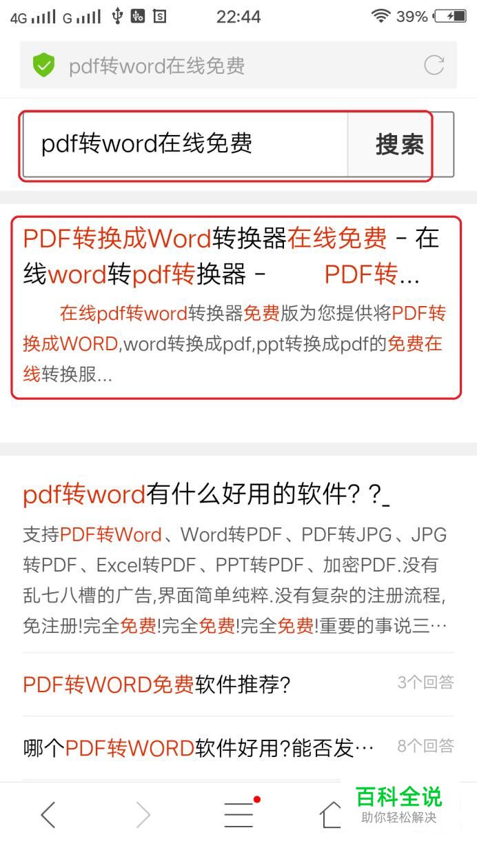 首先,我们打开手机浏览器,搜索“PDF转WORD在线”字样,如图所示,可以找到很多提供该服务的网址,我们点击第一个。