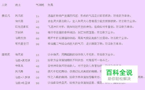 姜云凡,唐雨柔,小蛮,龙幽 的绝技列表,包换绝技名,气消耗,效果。
