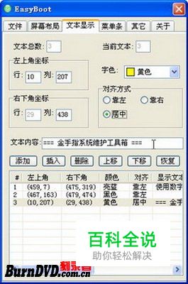 第2步,运行EasyBoot V5.1,在控制面板对话框中切换到“文本显示”选项卡。在界面预览窗口中选中顶部的标题文字,然后在控制面板“文本显示”选项卡中的“文本内容”编辑框中输入标题文字(如“金手指系统维护工具箱”),并按回车键,如图2009012347所示。 图2009012347 输入光盘标题文字