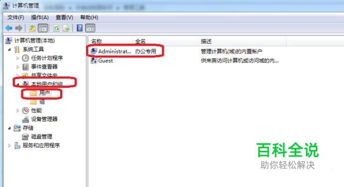 点击左侧栏里的“本地用户和组”,会出现扩展项,然后我们点击“用户”,右侧会出现管理员账户和来宾账户,我们双击管理员账户。