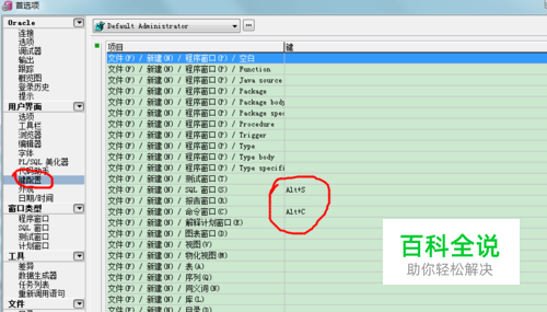 我们比较常用的是sql窗口,用来写sql语句,所以先设置一下打开sql窗口的快捷方式:首选项——用户界面——键配置,在对应地方输入你想要设置的快捷方式,一般常用Alt+S打开sql窗口
